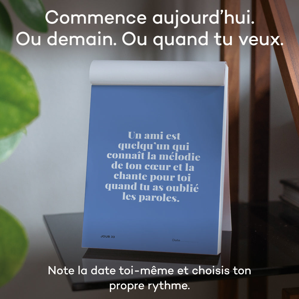 Ce calendrier à détacher n’a pas de dates. Pas d’histoire de janvier à décembre, pas de pression pour suivre le rythme. C’est toi qui choisis quand tu commences. C’est toi qui donnes le tempo.