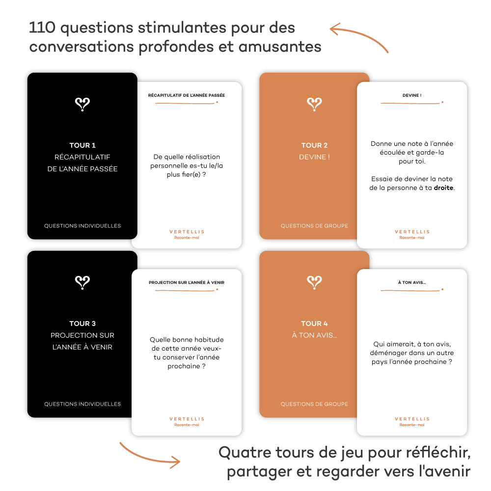 Regardez ensemble l’année écoulée, parlez de l’avenir et découvrez de nouvelles choses les uns sur les autres avec 110 questions inspirantes. Ici, on ne cherche pas à gagner, mais à créer des moments et souvenirs précieux.